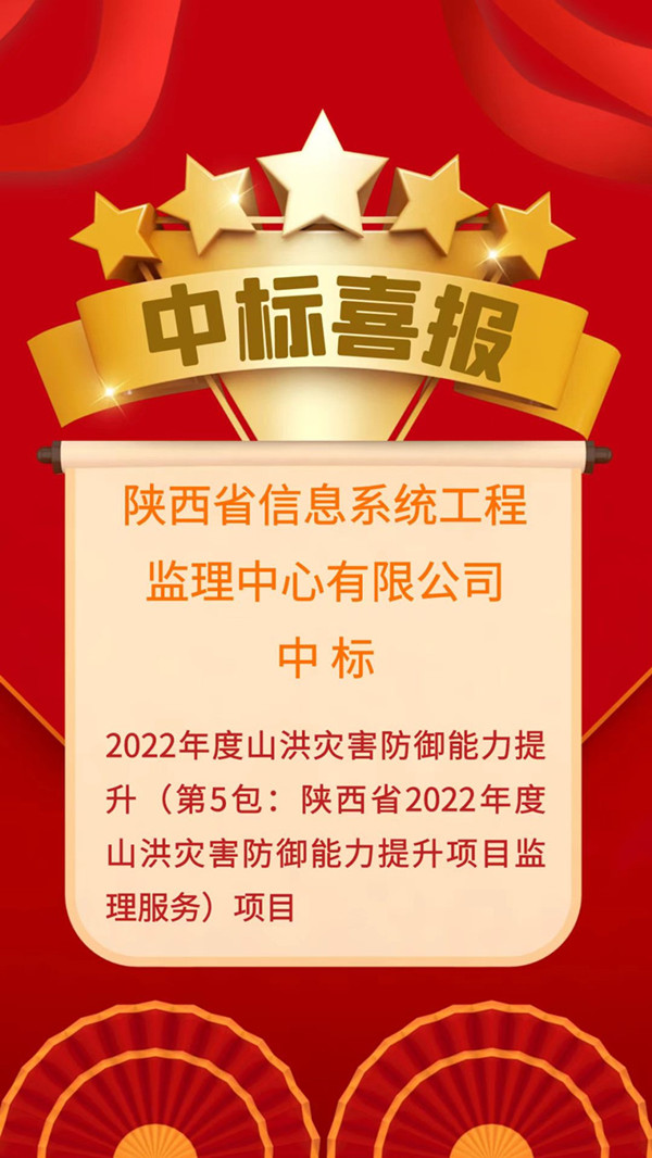奋力拼搏创佳绩,喜报频传振人心。陕西省信息系统工程监理中心有限公司捷报频传,8月30日成功中标2022年度山洪灾害防御能力提升(第5包:陕西省2022年度山洪灾害防御能力提升项目监理服务)。