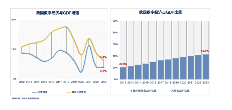 二是增效方面,数字经济在国民经济中的地位和作用进一步凸显。2023年,我国数字经济占GDP比重达到42.8%,较上年提升1.3个百分点,数字经济同比名义增长7.39%,高于同期GDP名义增速2.76个百分点,数字经济增长对GDP增长的贡献率达66.45%,数字经济有效支撑经济稳增长。