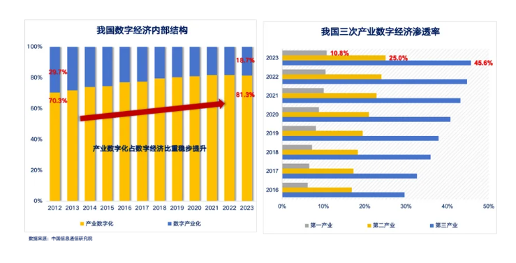 三是提质方面,数字经济融合化发展趋势进一步巩固。数字产业化与产业数字化的比重由2012年的约3:7发展为2023年的约2:8,2023年,数字产业化、产业数字化占数字经济的比重分别为18.7%和81.3%,数字经济的赋能作用、融合能力得到进一步发挥。